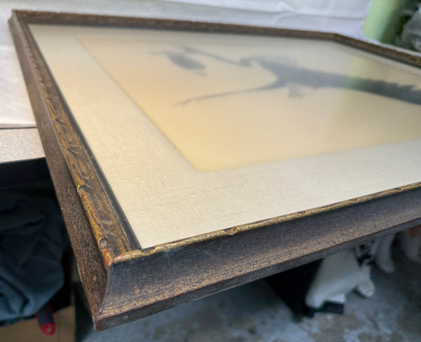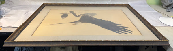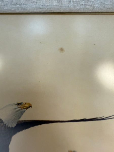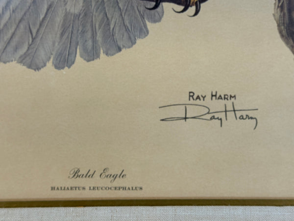 Ray Harm (1927-2015) was an American artist, best known for his paintings of wildlife, primarily birds. This depiction of bald eagles, one with spread wings, has the artist's signature printed along with title. Nicely framed with fabric mat and wood frame with non-glare acrylic. Print has a small smudge in top right quadrant (see photos.) Otherwise, piece is in Excellent condition.