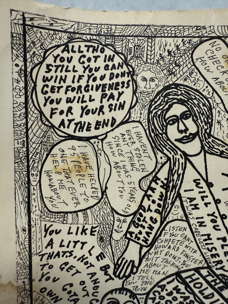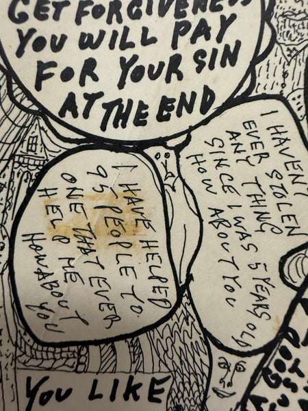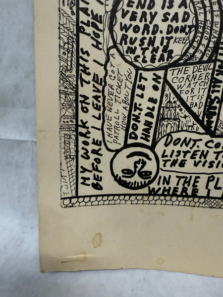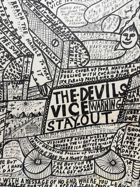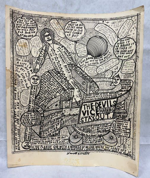 Printed on cardstock, this Howard Finster (1916-2001) piece titled "Devil’s Vice" is signed in black marked at the center bottom. The piece is a collage of images and text including Biblical references. The print has several condition issues including stains and spots of wax on the surface.