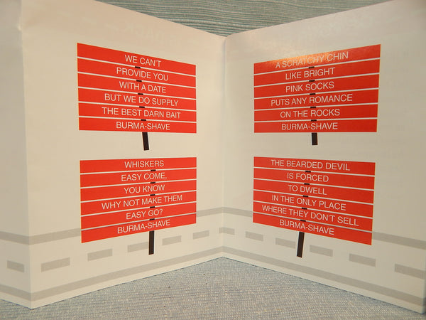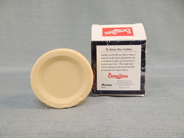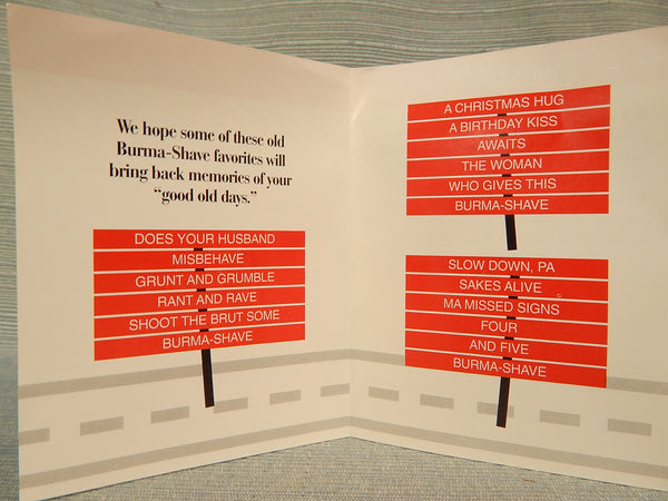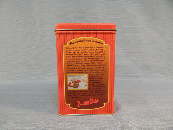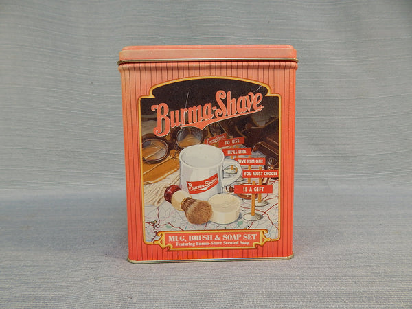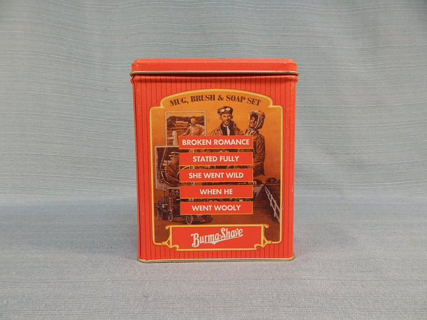 This tin contains shaving materials as well as foldout card with some of the famous Burma-Shave rhymes that used to be found on roadside signs. The contents have never been used and the tin is in good shape except for one scratch on the front side.