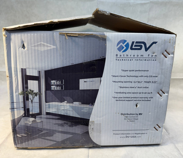 Ultra-Quiet Bathroom Ventilation Fan featuring noise level of just 0.8 sones. Ventilates spaces up to 90 sq. ft. Mounting opening: 9.25" x 9.0". Height: 7.5" Stainless steel 4" duct collar, HVI 2100-certified and UL Approved. Comes with mounting screws and instructions. See images for more product dimensions. Brand New, opened only to verify contents.
