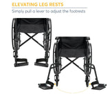 The Drive Medical Silver Sport 1 Wheelchair with Full Arms and Swing Away Removable Footrest, model SSP118FA-SF, has a powder-coated silver vein steel frame, padded armrests, and durable nylon upholstery. Urethane tires mounted on composite wheels provide durability and low maintenance, according to the manufacturer. Comes with push-to-lock wheel locks, carry pocket on the backrest, folding back canes for transport and storage. Max. weight capacity 250 lbs. Black, comes brand new, needs assembly.