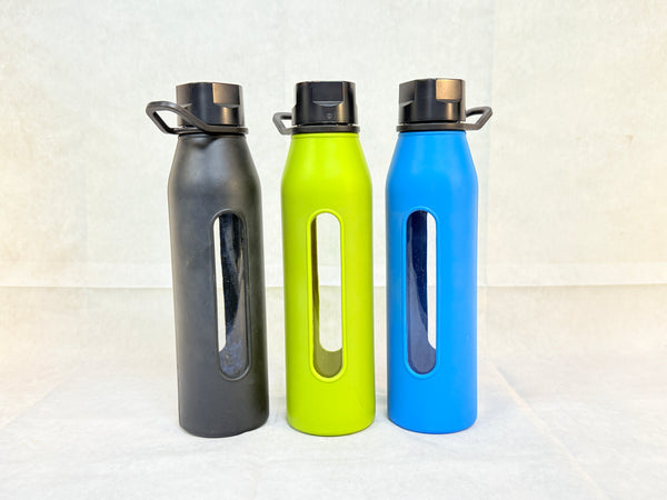 These water bottles in lime green, blue and black consist of clear glass bottle with a silicone jacket and carry handle. Approximately 20 ounce capacity. Dishwasher safe. Very Good Condition.
