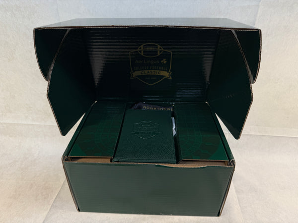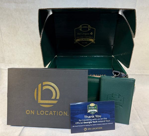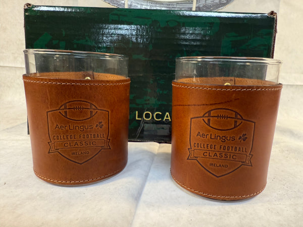 This boxed set of swag from the 2024 Aer Lingus College Football Classic includes a green leather zipped wallet on lanyard, 2 leather wrapped whiskey glasses, and an oval stadium metal plate. The glasses were made by Clayton & Crume Leather Goods. This collection was presented by On Location to those taking the Official Georgia Tech Ireland Tour that ended with Georgia Tech beating Florida State 24-21 in Dublin. Brand New.