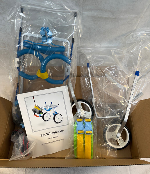 Foldable mobility pet dog Wheelchair For Back Legs. Comes with instructions for installation and all parts. The height, width and length of this PET WHEELCHAIR can be adjusted, and it can adapt to your pet within a certain range. The whole product is easy to assemble, you can install it yourself. The buckle design can hang the tow rope on the buckle to avoid losing pets. Size XS, Brand New in Box (box opened to confirm contents.) Size chart included in photos.