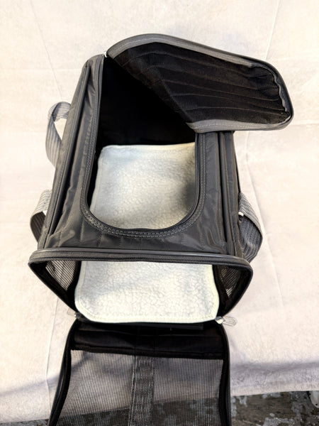 This stylish pet carrier has top and side entries for quick and convenient pet loading. Has locking safety zippers and 3 mesh panels for ventilation and airflow. A top mesh panel gives your pet visibility to see you while in their carrier, helping to soothe and decrease pet travel anxiety. A plush faux lambswool liner wrapped around a stability board cradles your pet and gives them a comfortable bed that keeps its shape. Size Medium is for pets weighing 16 lbs (7 kg) or less and measure 9.5" H x 16" L or less. Open dimensions are 17" L x 11" W x 10.50" H. New with tags.
