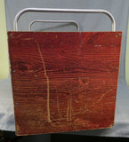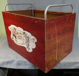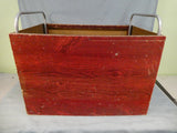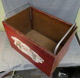 Made of particle board, this vintage toy box has a red wood-grained veneer and a decal on one side showing a boy and girl in American Western clothing with a lasso and a dog. Two aluminum tube handles grace the narrow ends for carrying. In Good, used condition with surface scratches and wear along edges (see photos.)