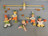 This hanging mobile features (5) 3.5" tall handpainted wood circus characters - ballerina, bear, tiger and 2 clowns. All dangle from (2) 13" dowels that swivel. Top of center dowel to bottom of ballerina's toe is 12". In Very Good condition.