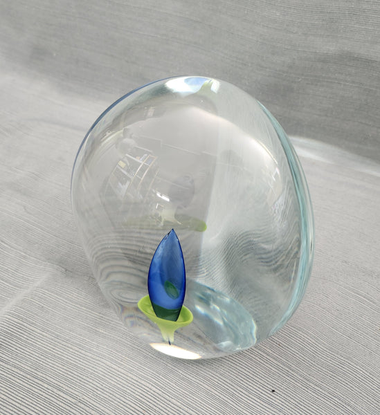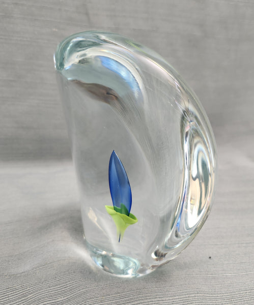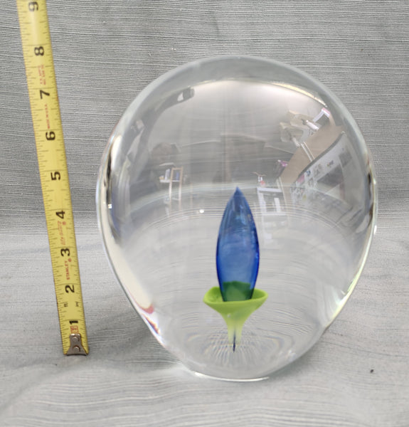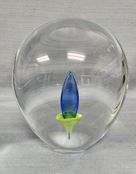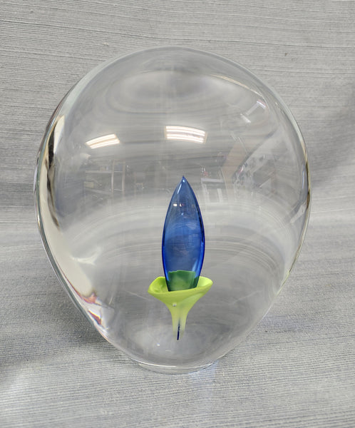 This beautiful clear glass piece has sommerso-style insertions of a deep blue bubble springing from a bright green base. It's an impressive size and quite heavy. Inscribed "BERANEK" on the bottom. Beranek Glass operated in Skrdlovice, Czech Republic from 1941 to 2008.