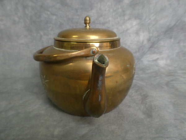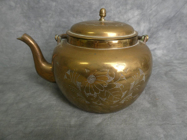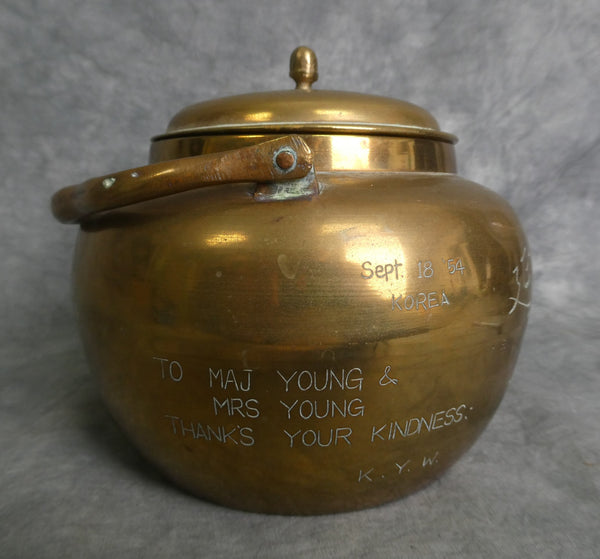 This lovely solid brass teapot is adorned with flowers on both side and on the lid. And it has a personized dedication on the back reading "To Maj. Young & Mrs. Young Thanks Your Kindness K.Y.W. Sept 18 '54 Korea". So, just a year after the Korean War ended, this piece was presented to the Youngs. In Very Good condition.