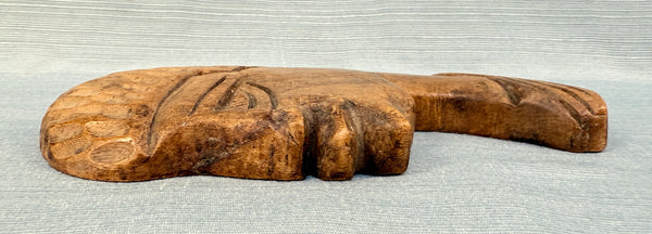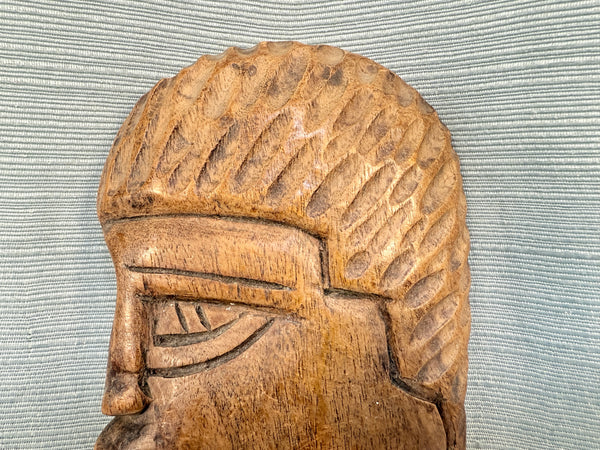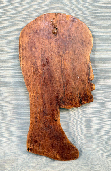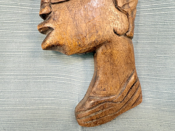 This expressive wood head profile is carved from medium dark wood. It has a hanger on the back. Very Good Condition with a smali chip on the back, not visible when hung.