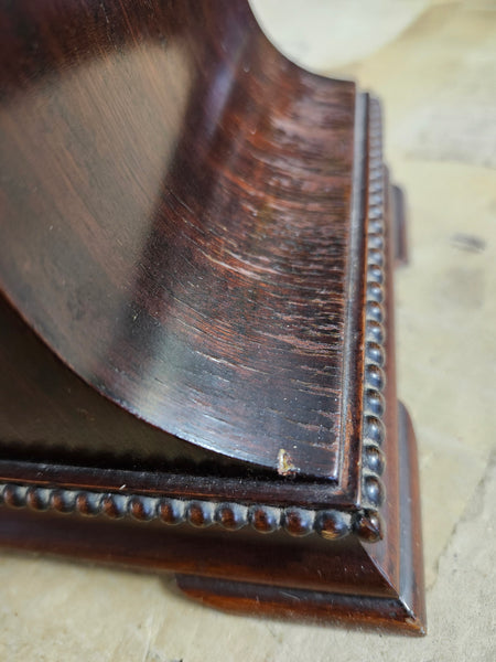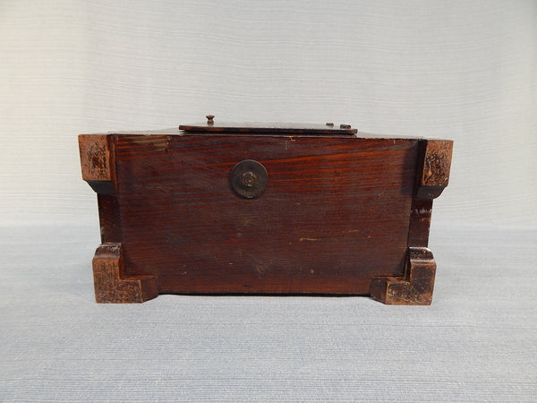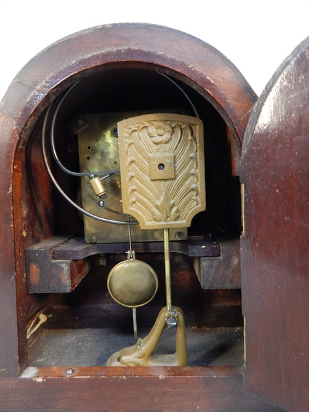 Mahogany dark stained veneer wood case clock made by Junghans of Germany. Probably dates to the 1930-40s. Unmarked by maker, but the clock works are distinctive to this manufacturer. Included are the winding key and pendulum. Could not get clock to work, so will need repair or to be used as decor or parts. Priced accordingly. In Good condition with some flaking of stain on bottom sides (see photos.)