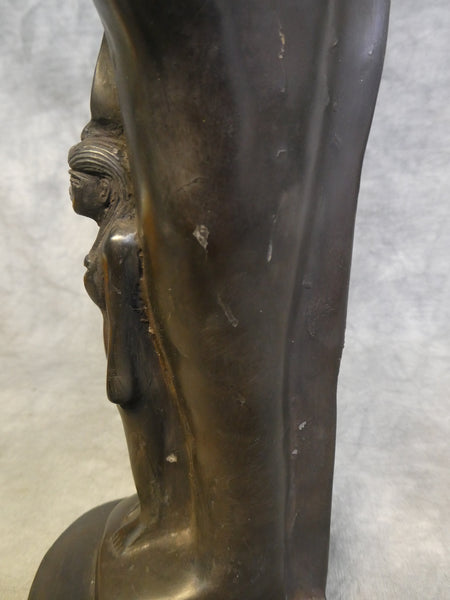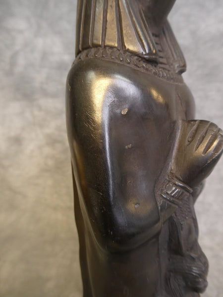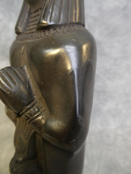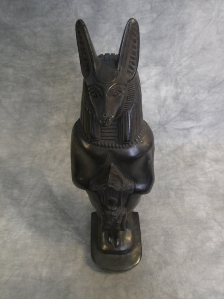 This lovely carved stone figure depicts Anubis with Isis. Anubis was the Egyptian god of mummification and the afterlife. With the head of a jackal, Anubis oversaw mummification and guided the dead into the afterlife. Isis is known for her magical abilities, including the ability to resurrect the dead. He is often paired with Isis because of her association with motherhood and the cycle of life and death. This 11.5" tall statuette is finely detailed and in Very Good Condition. It has a few small dings to the surface (see photos for close ups.)