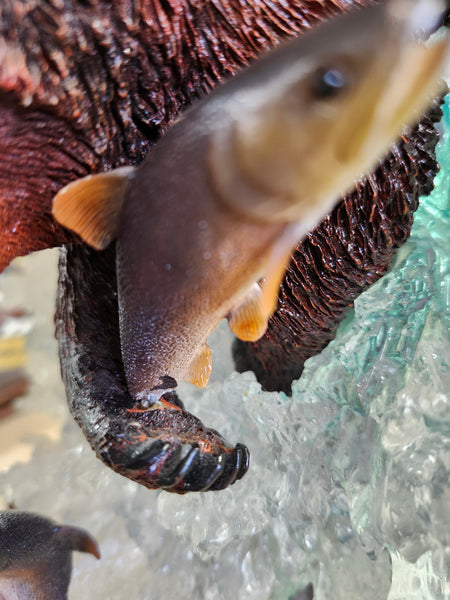 Distributed by Simpkins Wildlife of Utah, this 17" h x 12" w x 15" d sculpture is made of molded resin. It depicts 2 Grizzly bears in pursuit of a meal as 5 salmon attempt to swim up a water fall to spawn. This dramatic scene is very detailed. In Good condition with a few small issues with the fish - 1 is attached by a rod to a bear's paw and it swivels slightly; 1 has a cream paint smudge on nose; and 1 appears to have been glued on at the near the caudal fin (see close up photos.)