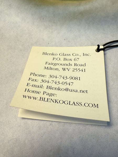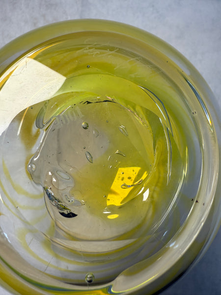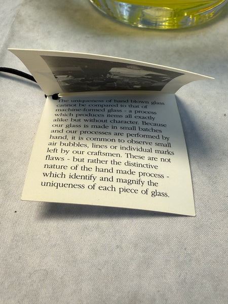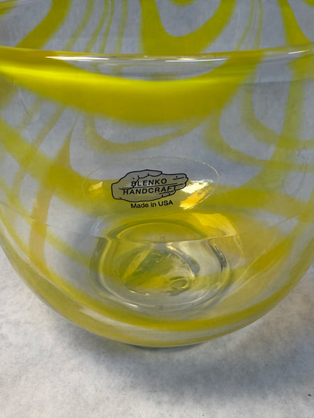 Attractive handmade clear glass bowl with yellow swirls. Signed by Richard Blenko. Like New Condition with the original tag.
