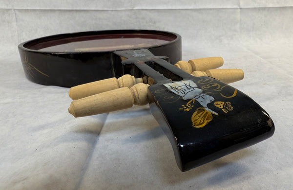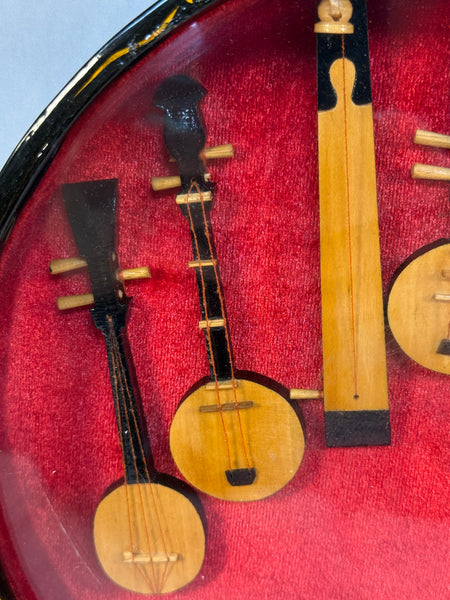 Unique handcrafted miniature Oriental musical instruments displayed in a wood, Mandolin-shaped shadow box frame.This display holds 8 instruments. The black lacquer frame is decorated with hand painting and inlay. Neck has 4 pegs. Condition is good with a few small edge chips and cracks in laminate (see photos.)