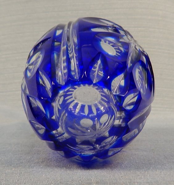 This pretty vase is cobalt blue cut-to-clear with a starburst pattern. Very Good Condition.