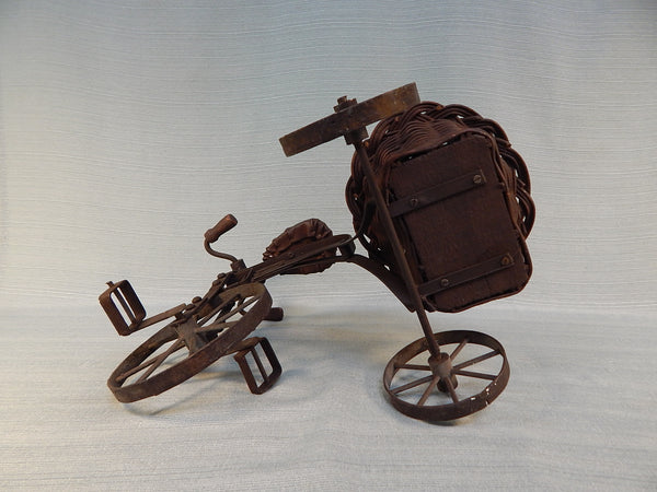 Antique-style metal tricycle with wicker basket for indoor or outdoor decor. Has a rustic, primitive look with lots of charming details. Use for plants, flowers, dolls, etc.