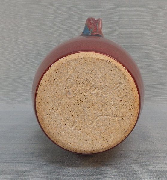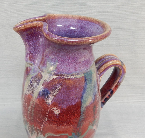 This large, colorful pitcher is glazed in red, dark blue and purple. Made by Bruce Larrabee and originally sold at Worthington Gallery in Springdale, Utah. Very Good Condition.