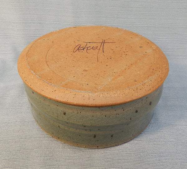 This bowl has a gray-green speckled glaze on the outside and off-white speckled glaze on the inside.  There is some crazing of the outside glaze but otherwise in Very Good Condition. Signed but unable to read.