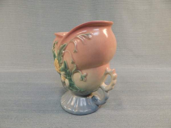 This pretty vase is pink, yellow and green with two double loop handles and different flowers on each side. Very Good Vintage Condition.