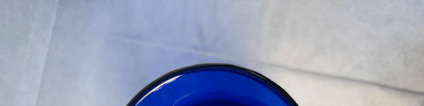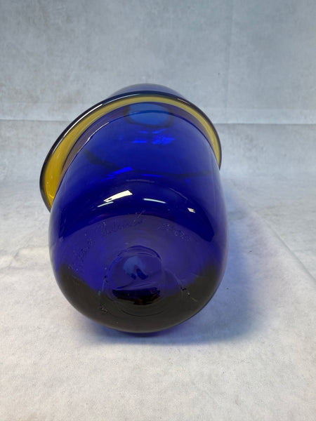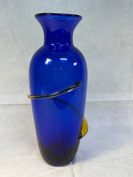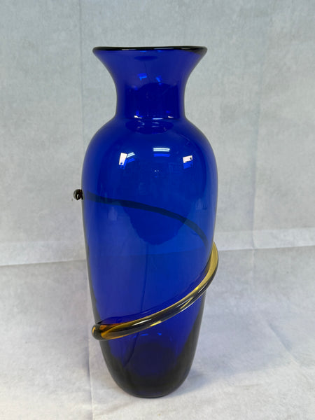 Beautiful handmade cobalt blue vase embellished with a topaz yellow coil. Signed "Richard Blenko 2000". Pristine condition.