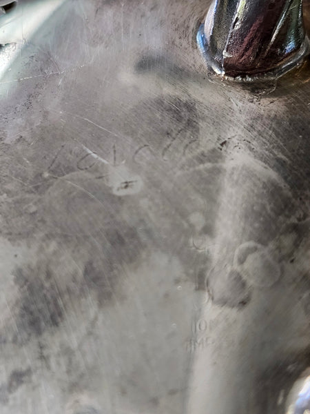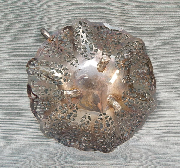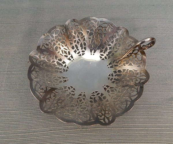 This 6" diameter, footed candy dish was produced by Lovelace International Silver Co. Has a lovely lace doily design with side handle. Silver plate, in Very Good condition with a few small surface scratches in base.