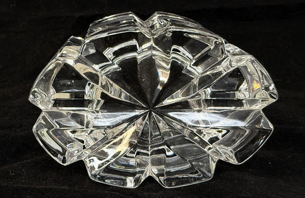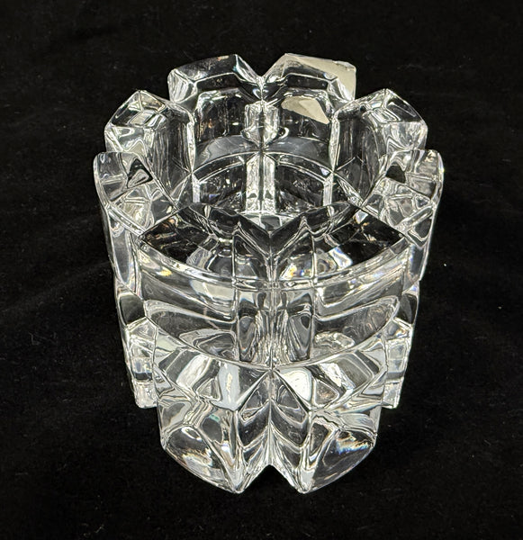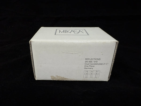 This faceted clear crystal candleholder was made in Germany by Mikasa. Oval with beveled cut design, has a 2" diameter opening for a candle. In Excellent condition with no chips or cracks. Comes in original box. Box has some surface tears.