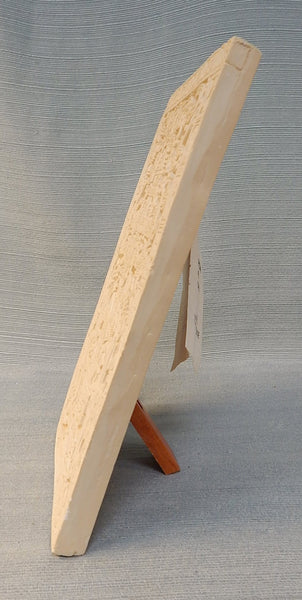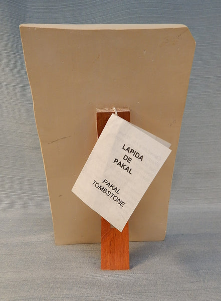 This elaborately carved plaster piece is a replica of the sarcophagus lid of the first Mayan tomb found in a pyramid at Palenque in Mexico. It has a wooden stand and is in Very Good Condition.