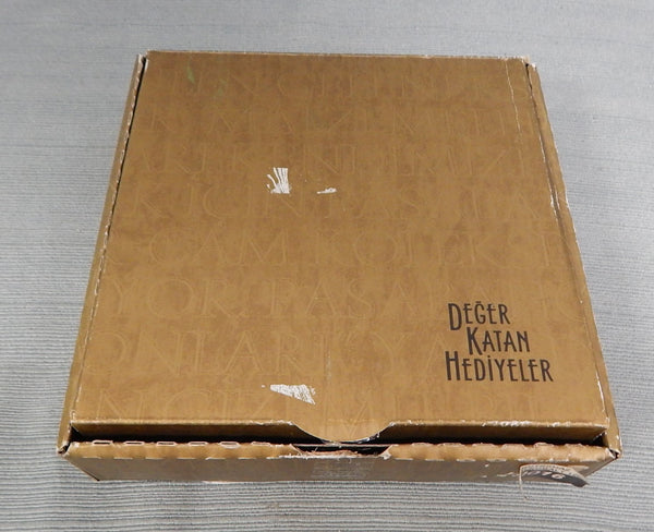 Made in Turkey, this turquoise, blue and white glass piece is known as an Evil Eye. Also known as the nazar boncugu, it is believed to protect from bad energies and emotions in Turkish and Greek cultures. This amulet is like new in original box with brochure.