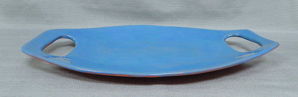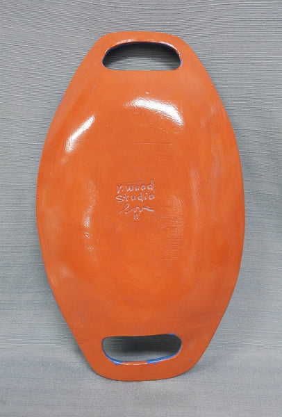 This lovely oval platter with integrated handles was crafted by Rebecca Wood of Athens, GA. According to the maker, this piece is oven safe and dishwasher safe. Not recommended to use in the microwave. In Excellent condition. Retails online for $90.
