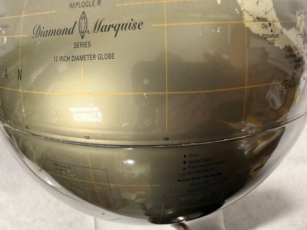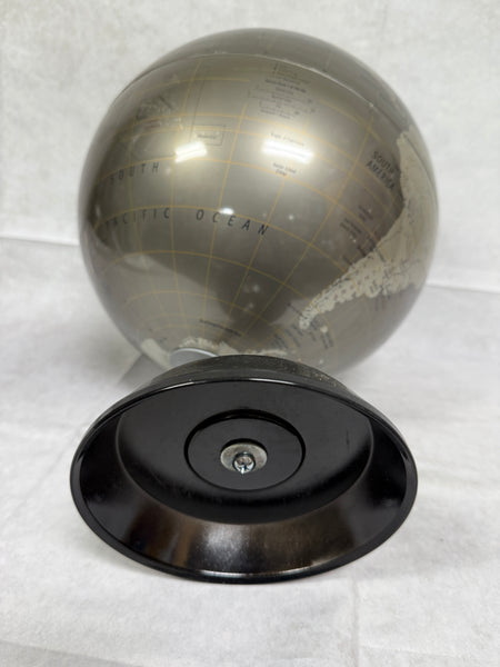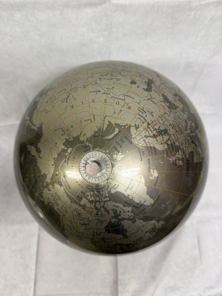 This handsome globe has an attractive two-tone metallic finish and rests on a simple black metal stand. It's up to date and has only a slight bit of wear along the Equator.