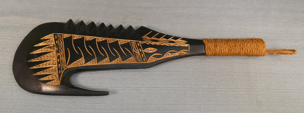 This handsome carved wood war club Is black painted wood with incised Samoan decoration and triangular points that emulate shark teeth. The handle is wrapped in jute. Very Good Condition.