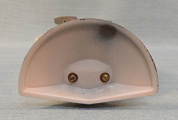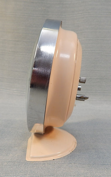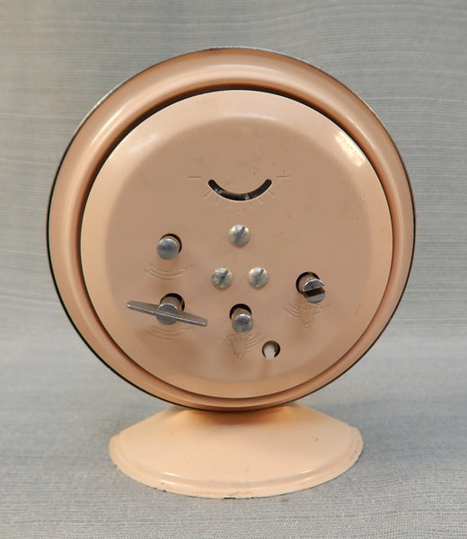 This clock appears to be vintage, but is unmarked by maker. The face features a 1950s style illustration of a family around a table with the saying - "There's never a bad time to eat," said Betty gaily. This small desk clock has an alarm that rings. The clock runs and the alarm rings, though not sure if they function perfectly. The face also has a small hole near the # 6 which reveals the day of the month. Peachy beige metal case.