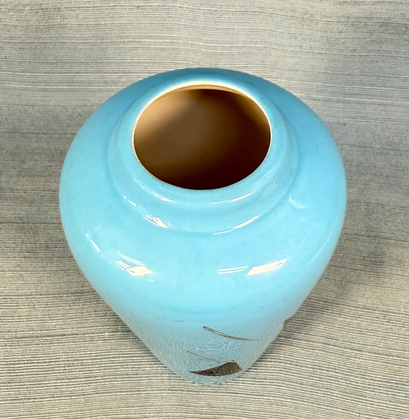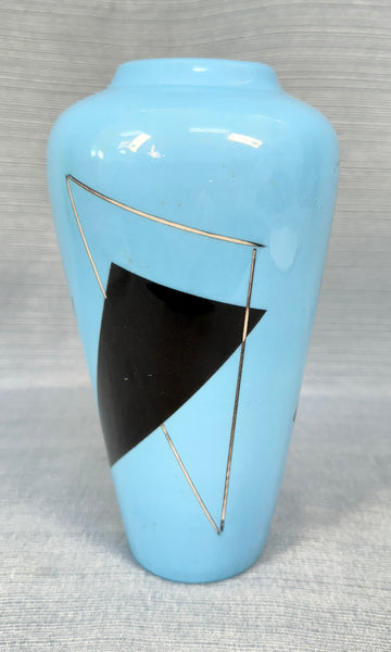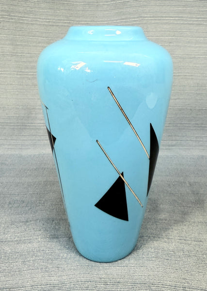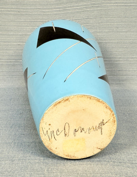 This ceramic vase has a classic shape and is decorated with black triangles and lines that look like long sticks. Nicely made and signed "McDonough". This may be Mary McDonough of Jackson, SC, but we are unable to confirm. Very Good Condition.