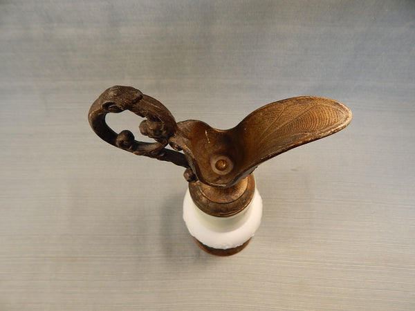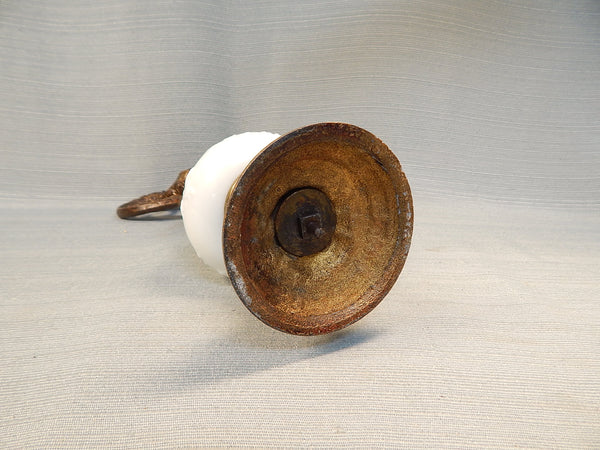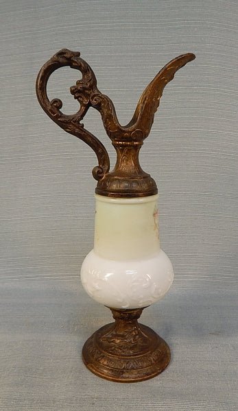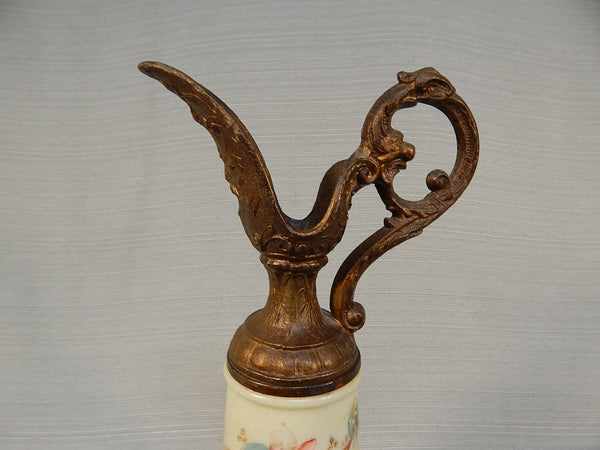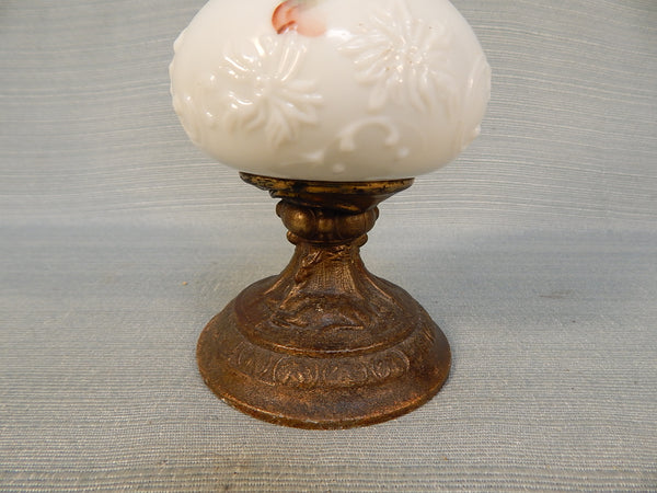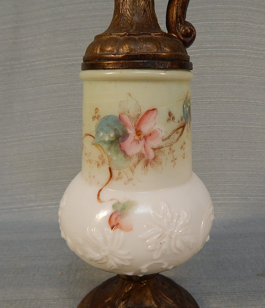 This dainty decor piece features handpainted, milk pressed glass body with metal top and base. Features delicate pink flowers with blue green leaves. No chips or cracks.