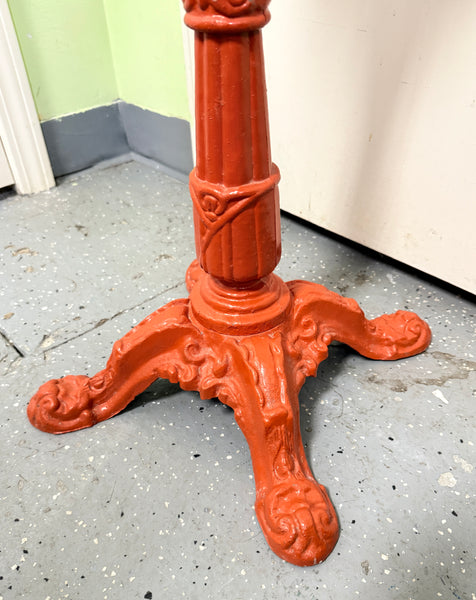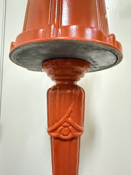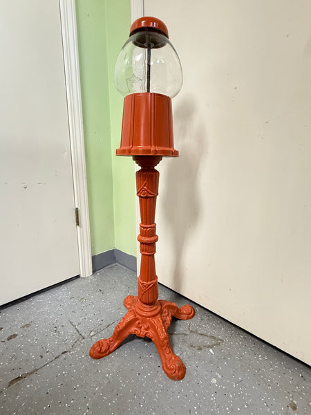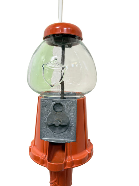 This fantastic candy machine is in Very Good condition with a few niches of paint off the base. Red painted base and stand, clear glass candy jar has a raised acorn pattern and the coin plate is adorned with acorns and oak leaves. Untested on candy and coins, but coin mechanism turns and recoils. Original red paint, made in the USA by Carousel. Its unique design and American craftsmanship make it a desirable piece for collectors or vintage enthusiasts.