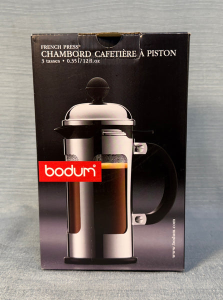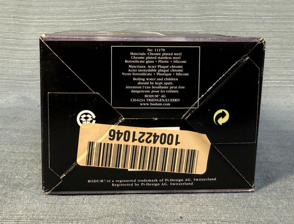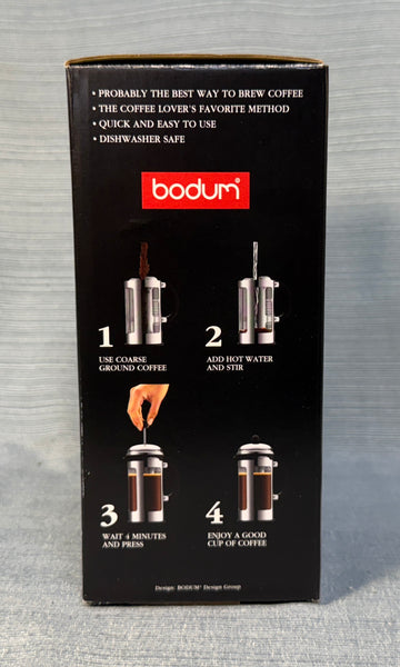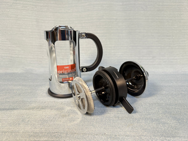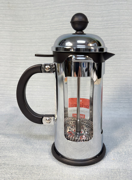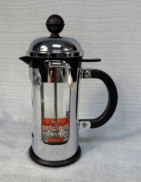 This press is stainless steel with a heat-proof glass insert. The 12 oz. capacity is billed as "3 cups", but those are really small cups! Very Good Condition in the original box.