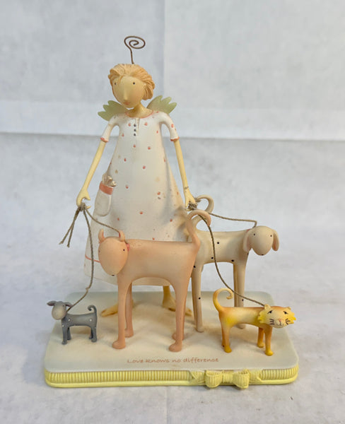 This figurine of an angel walking 3 dogs and 1 cat is part of Demdaco's Pure of Heart collection. Called Love Knows No Difference, this decor piece comes in original box with original foam insert, so Like New! Copyrighted 2005, designed by Claire Stoner.