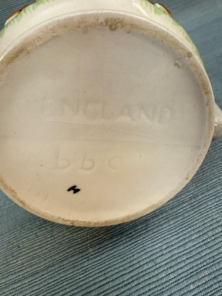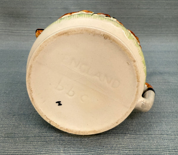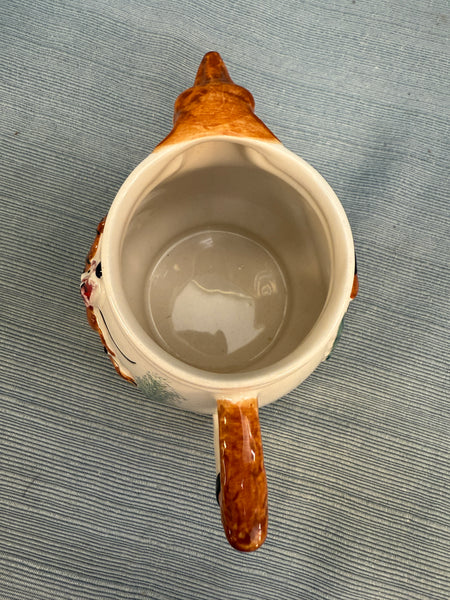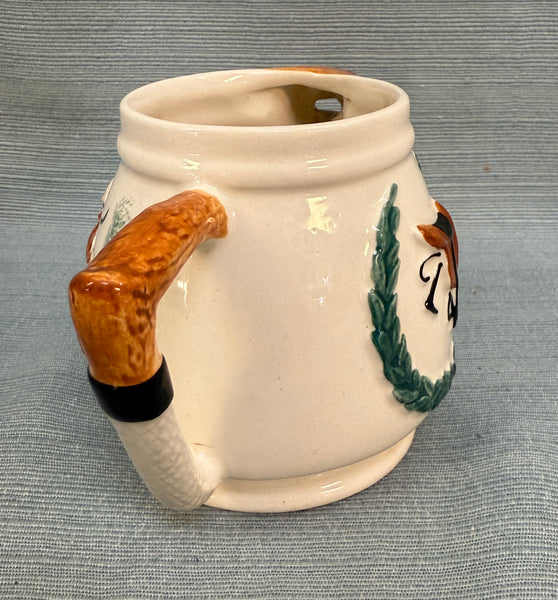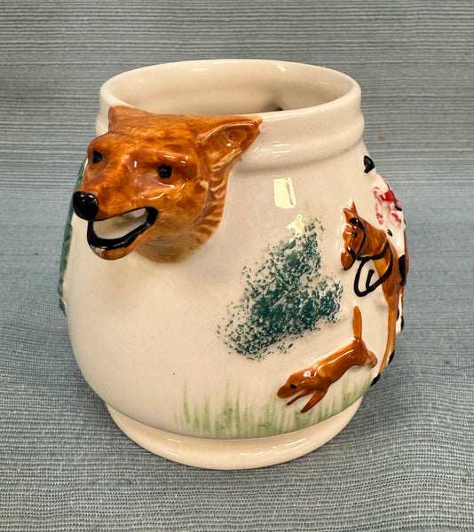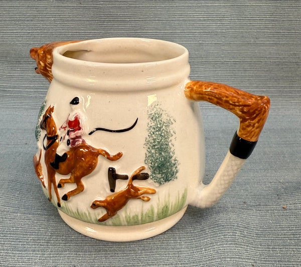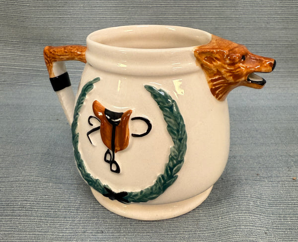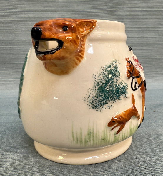 This whimsical creamer has hand-painted fox hunt scenes on one side and a saddle on the other. The handle is a fox tail and the spout is a fox head. Mint Condition, made in England.
