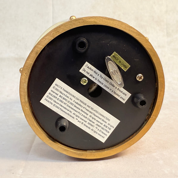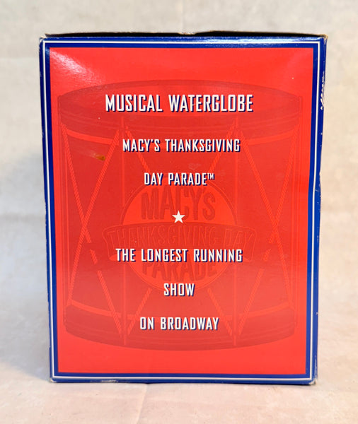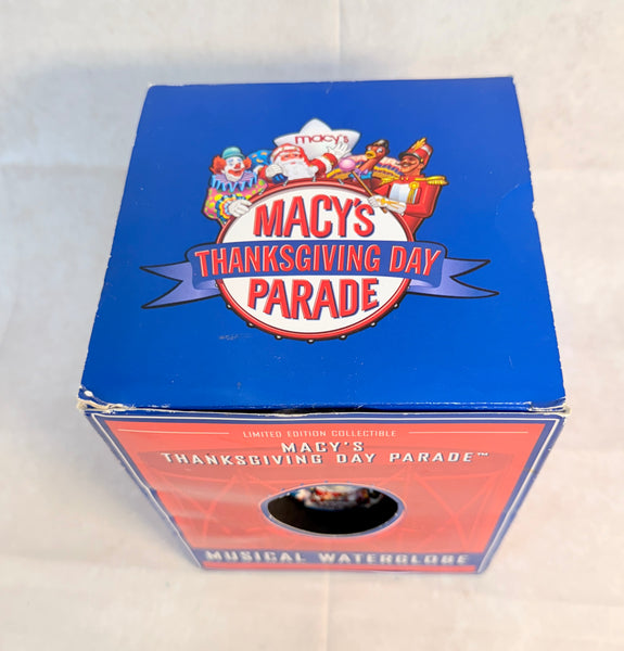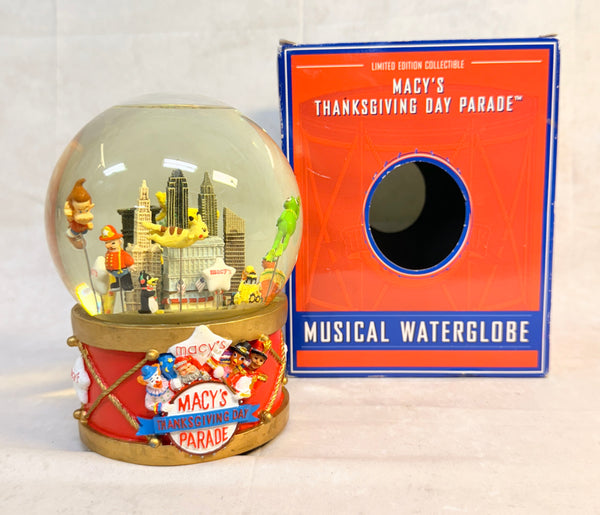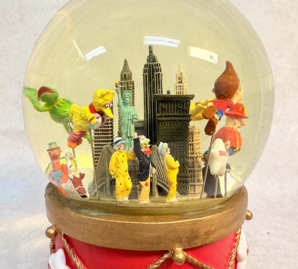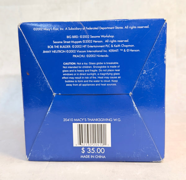 Comes in original box with original foam insert, this limited edition 6" h x 4.5" diameter snow glob features a skyline of New York with the Statue of Liberty, the Flatiron building and Macy's. Floats include Big Bird, Kermit, Pikachu and Johnny Neutron. There are also clowns, a penguin and a turkey! The music box works and plays a lively tune. The water has yellowed very slightly. Otherwise in Excellent Condition.