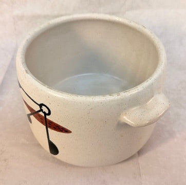Cream speckled crock for use as a bean pot of cookie jar, decorated with stylized kitchen fork and measuring spoons.Very Good Condition with no chips or cracks.