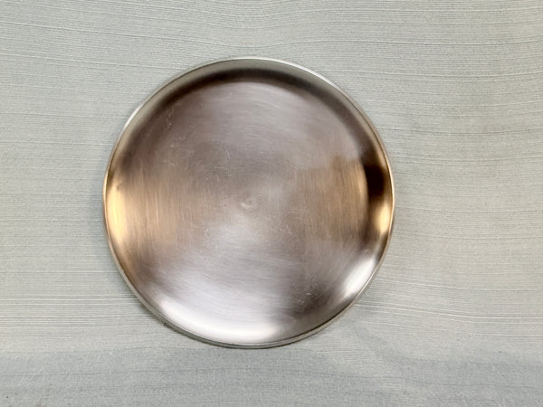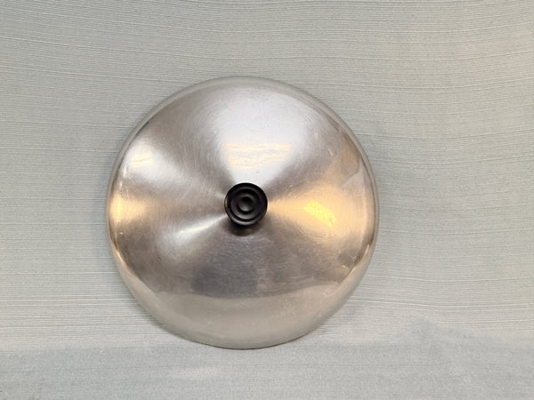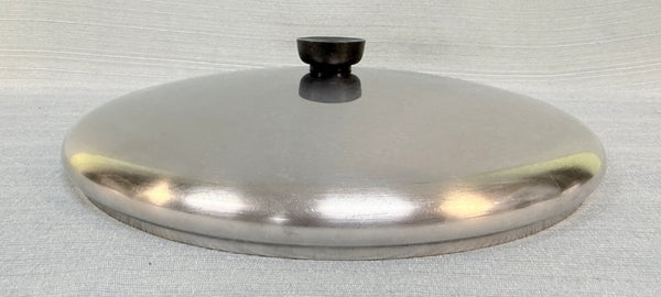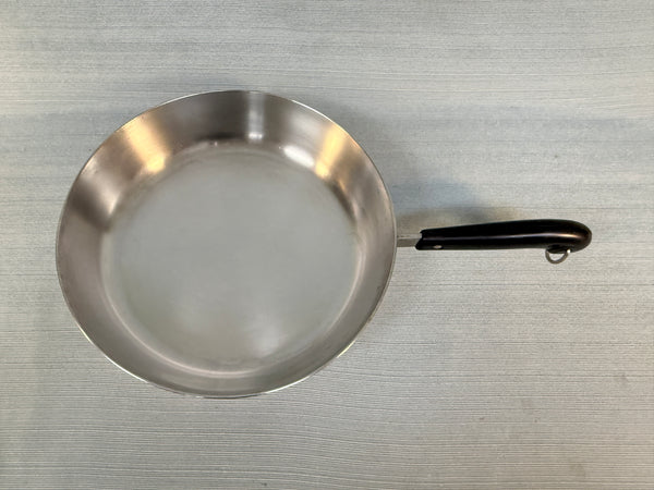 This skillet is stainless steel with a copper bottom. The inside is clean and has utensil marks typical of use. The copper bottom has staining as expected for a piece of this age. The handle is missing a screw (see photos) that does not affect its usability.