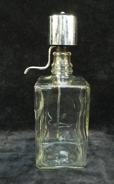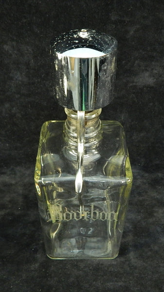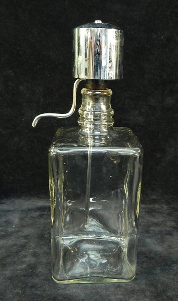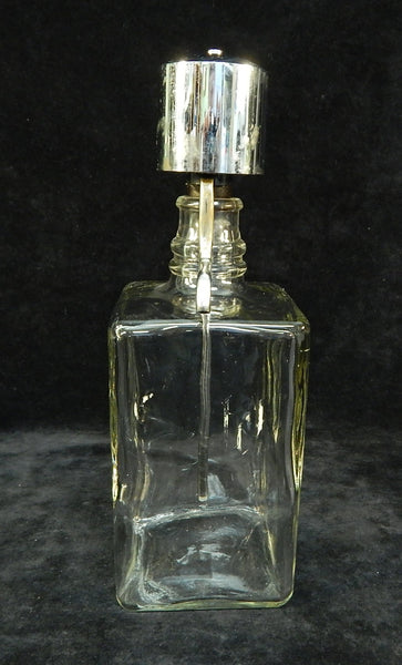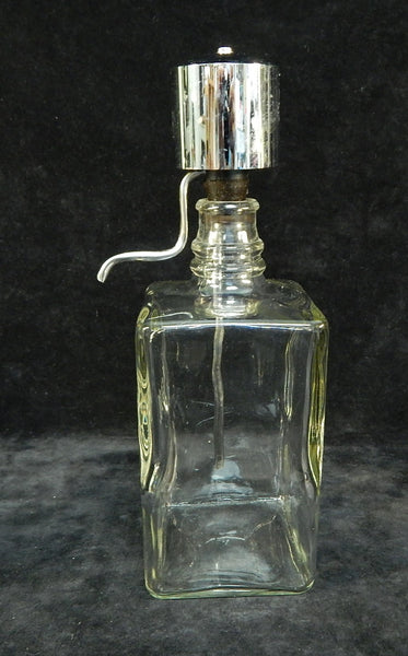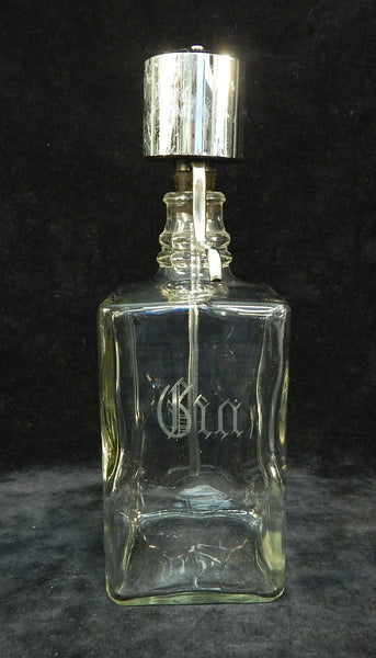 These square glass bottles have chrome dispenser tops. Two of the bottles are labeled Gin and Bourbon; the other one is unlabeled. There is a little bit of pitting on the chrome, but otherwise they look great.