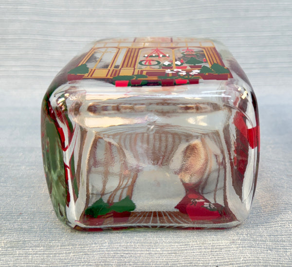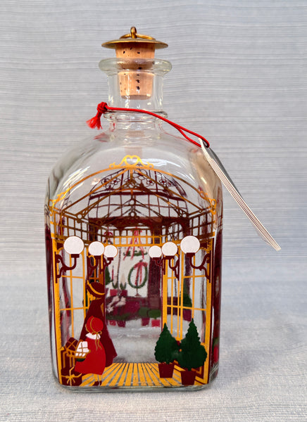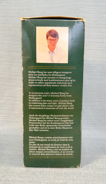 This glass bottle is decorated with a Christmas-themed design by Jette Frölich. The bottle, with a brass and cork stopper, was designed by Michael Bang. The Christmas bottles have been a Holmgaard tradition since 1981. Very Good Condition in the original box., made in Denmark.