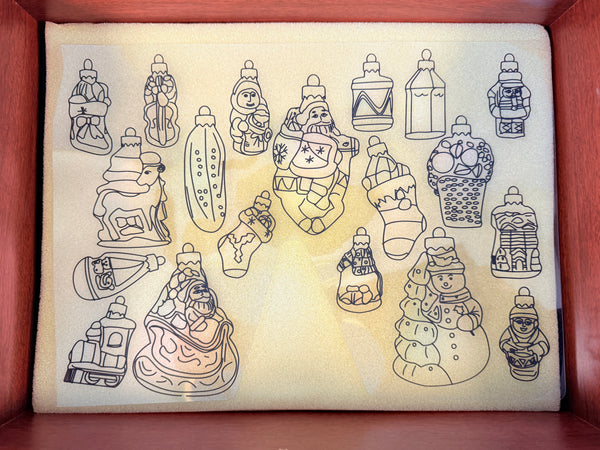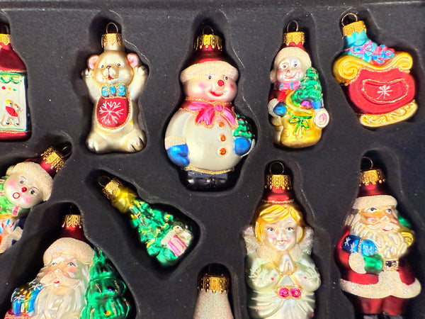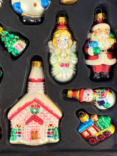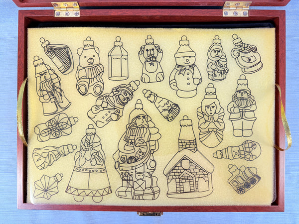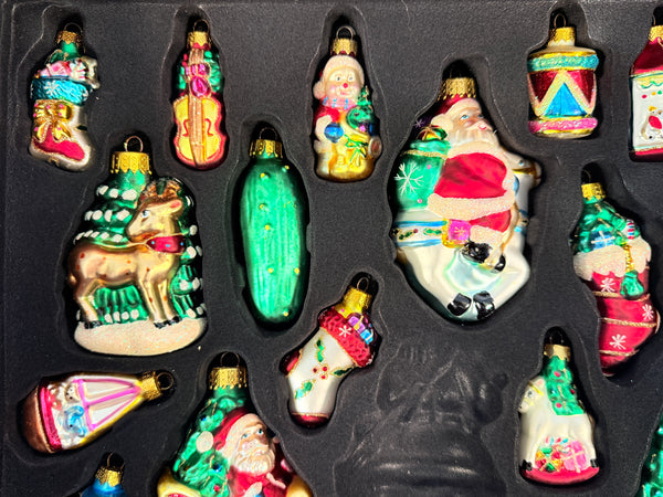 This wooden storage box contains places for 39 ornaments and templates showing each one (a 40th space is empty.) Santas, snowmen, toys and more! All are made of glass with glitter. And all are in Excellent Condition with no chips or cracks. Storage box has a few scuffs and surface scratches.