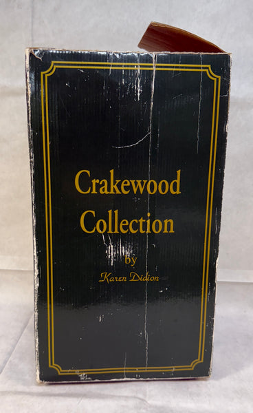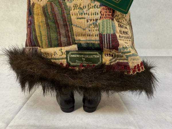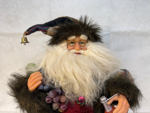 Designed by Karen Didion, this expressive Santa has a brocade coat and hat and holds a wine jug and grapes. Comes with his original paper tag and in original box. Santa is in Excellent Condition. Box is missing top flap and has other edge damage.