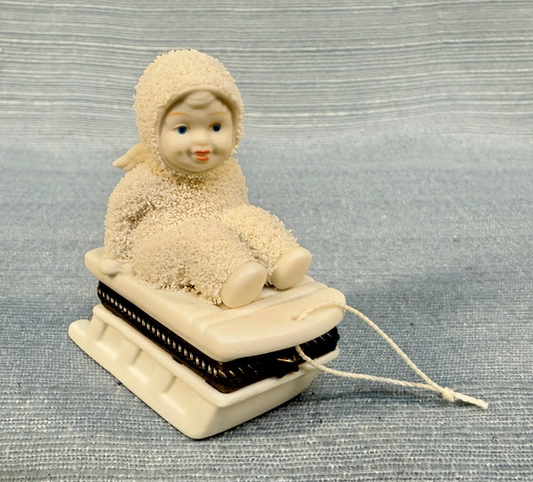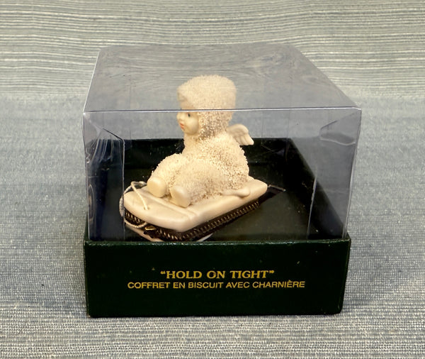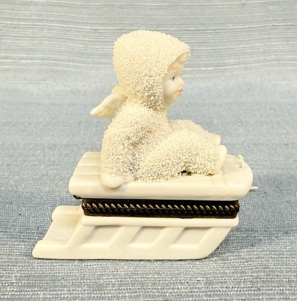 This small 2" w Department 56 Snowbaby is an angel on a sled. Called Hold on Tight, this ornament is also a hinged box. Put something special inside and see the surprise on Christmas morning! In Excellent, Like New condition in original box with original tag.