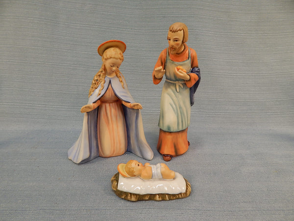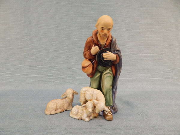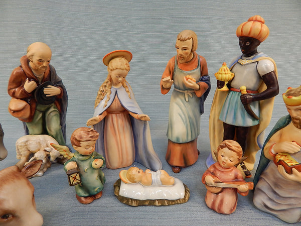Made in W. Germany, this vintage porcelain Christmas Nativity scene includes 12 figurines: Mary, Joseph, baby Jesus, 1 wise man, 2 shepherds with sheep, a cow, a donkey, a lamb, a sheep, and 2 angels. For reference, the wise man figurine is 8" tall. All are in Excellent Condition with no chips or cracks.