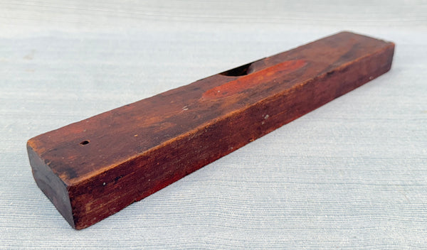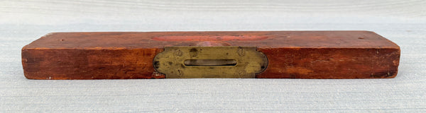Stamped "102" on the block near to the bubble vial, this wood level has a glass bubble vial and brass fitting. In good, used condition, this level is 14" w x 2.25" h x 1.25" d.