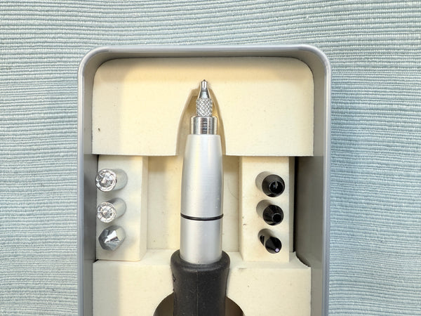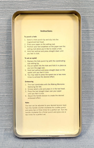 This easy tool allows one to punch holes and set eyelets. Eliminates the need for hammering. Just set the tension control in the handle, and let it do the hard work. Includes 4 setting tips, 3 punching tips and setting mat. The magnetic head makes changing tips easy. Used, but complete set. Comes in tin storage box.